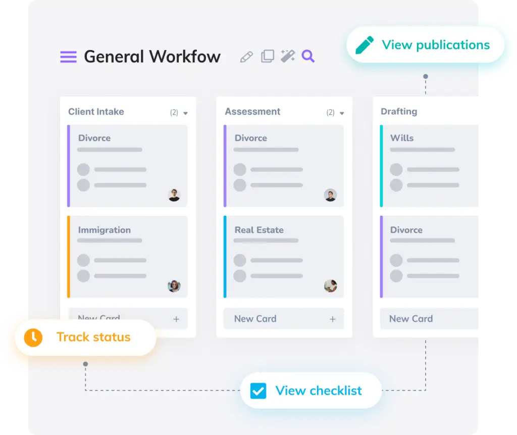 Legalboards excels with its visual, Kanban-style workflows, making it easy to track progress and customize processes. It complements tools like Clio by focusing on automating repetitive tasks and centralizing workflows. This ensures a streamlined and highly productive setup.